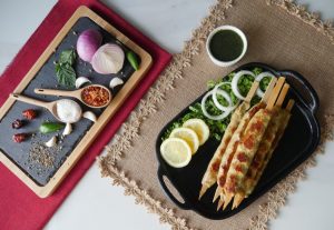 In a chopper,add chicken,mint leaves,fresh coriander,squeezed onion,ginger garlic paste,red chili powder,baking soda,coriander seeds,cumin seeds,red chilli crushed,garam masala powder,desiccated coconut,salt,green chillies,butter,cheddar cheese,mozzarella cheese,cream & chop until well combined and refrigerate 1 hour.