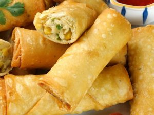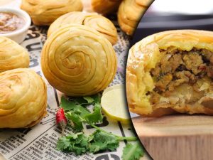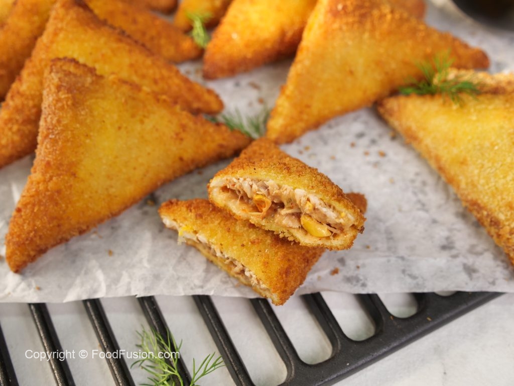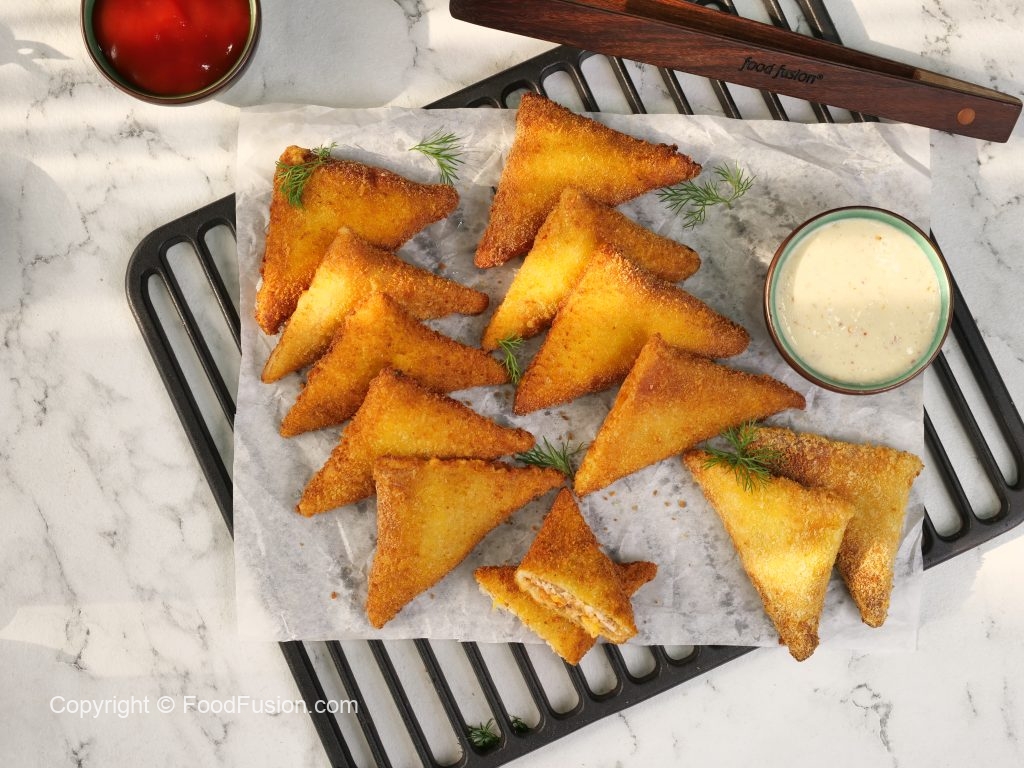 -First, dip samosa in whisked eggs, then coat evenly in bread crumbs.