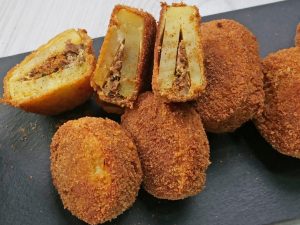 -Take whisked eggs in 1 flat bowl and bread crumbs in another flat bowl.