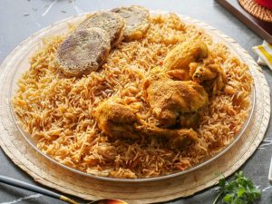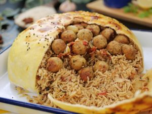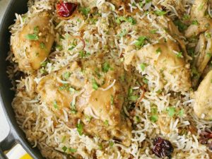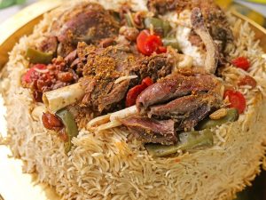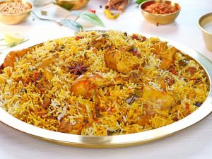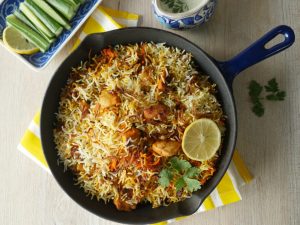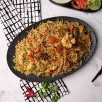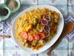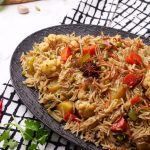 -Add capsicum,spring onion leaves,saffron essence,fried onion,cover with kitchen cloth & lid and steam cook on low flame for 10-12 minutes.