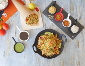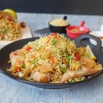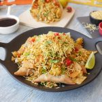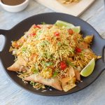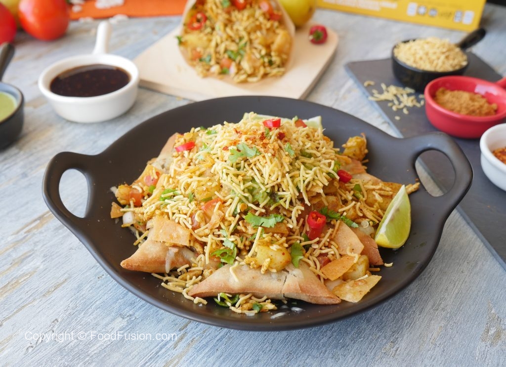 On a serving plate,add chicken samosa and break them with the help of the spoon.