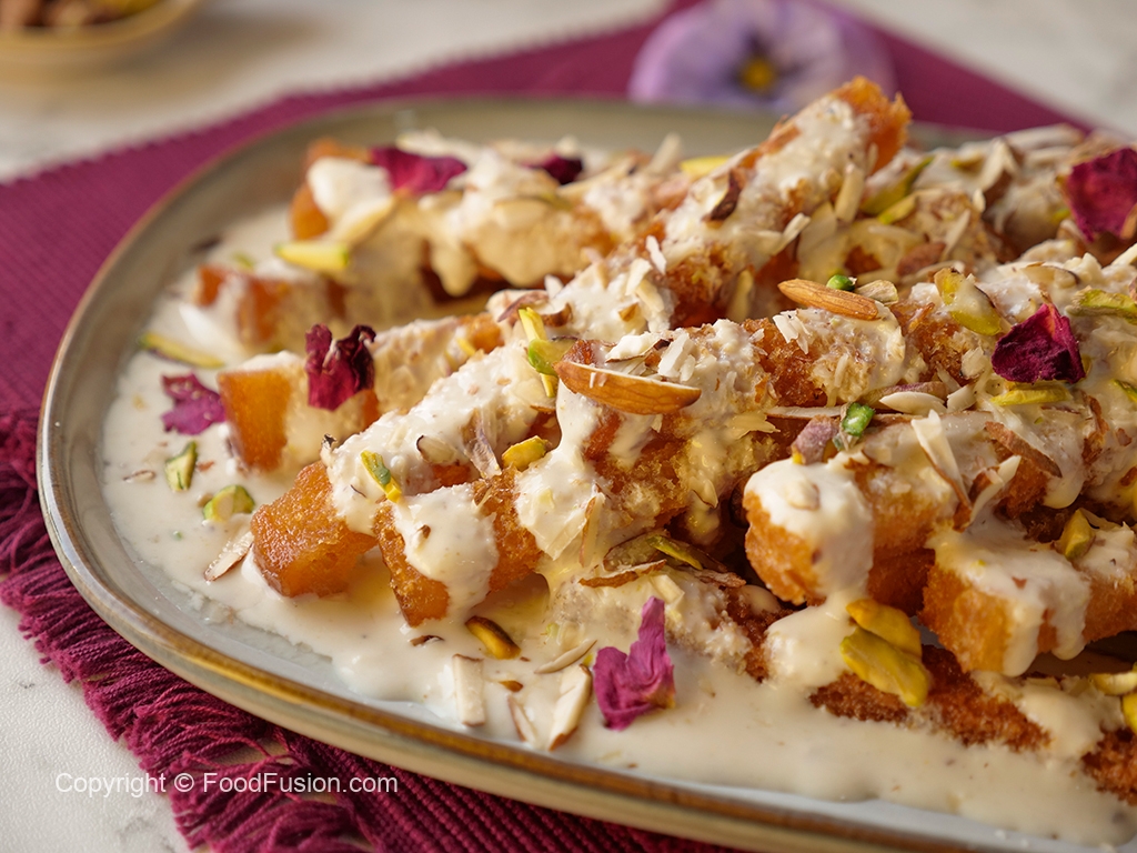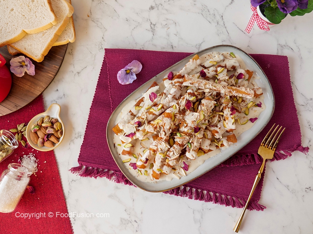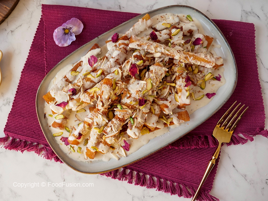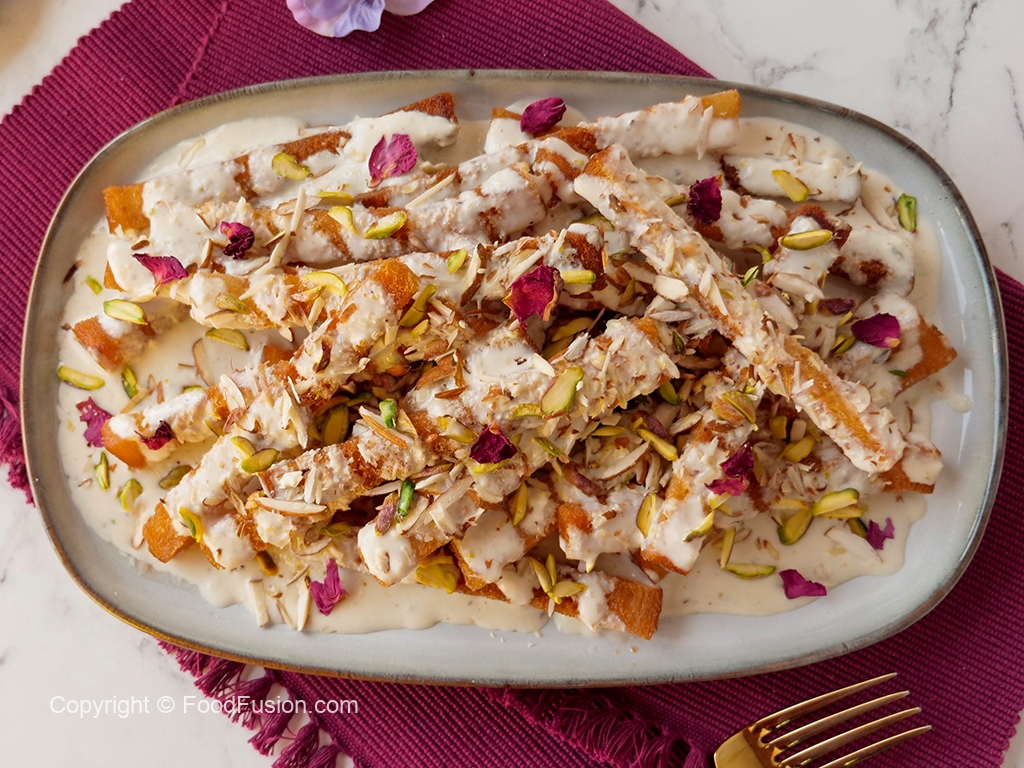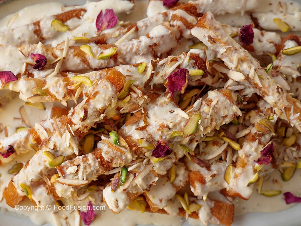 Serving plate mein fried bread sticks,sugar syrup,milk syrup,badam aur pista dal dein.