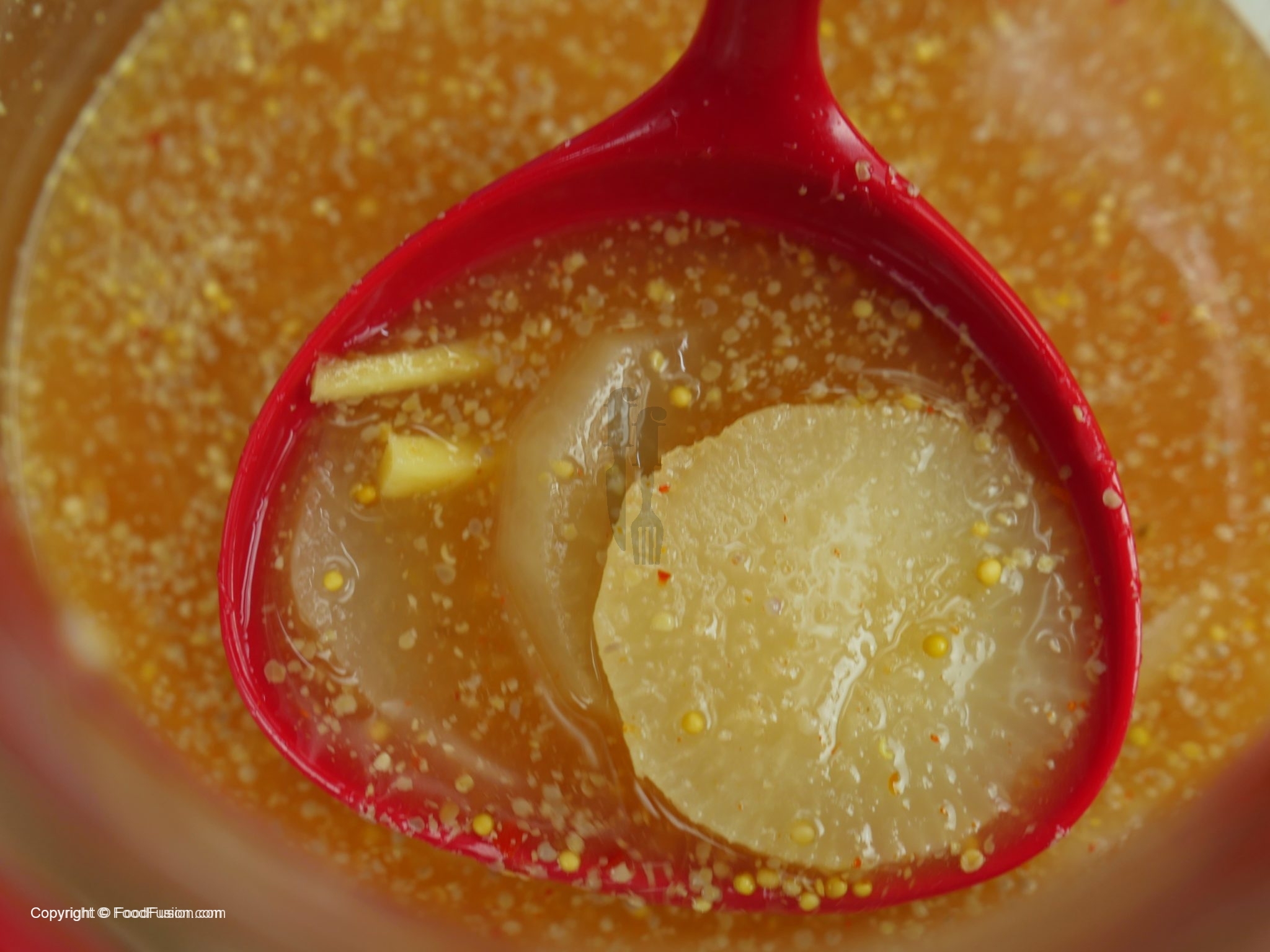 In turnips,add ginger garlic paste,salt,red chili crushed,ginger (julienne),brown sugar,vinegar,mustard seeds(crushed),red chili powder,water (boiled) and mix well.