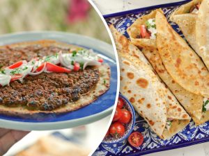 -On tortilla,add& spread prepared tahini sauce,paprika powder,prepared chicken,prepared salad, pickled cucumber,fold & wrap in butter paper & serve!