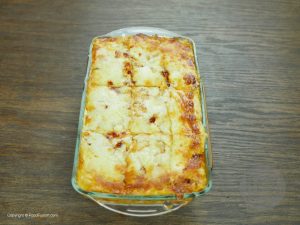 Once golden crust of mozzarella appears on the top then turn off the oven. Put baking dish aside and cut lasagna into square shape and now it’s ready to serve.