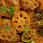 -In a cooking pot,add lotus root stem,water,pink salt & mix well,turn on the flame,bring it boil, cover & cook on medium flame until tender (20-30 minutes) then strain & set aside.