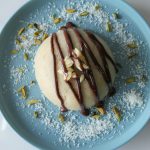 Add a scoop of king kulfa and cover with semolina halwa then flip on serving plate and garnish with desiccated coconut,pistachios,fried almonds,chocolate sauce & serve!