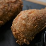 • When pressure is released, unclamp the lid and remove it. The oil will still be boiling, so be careful. Move the chicken to a rack or paper-towel-lined plate to drain any excess oil.