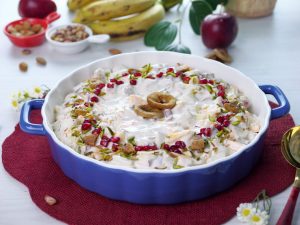 -In a serving dish,add prepared cream fruit chaat & garnish with pistachios,almonds,fig,pomegranate,fig & serve!