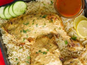 -Jug mein pani,dahi,hari mirch paste,lehsan adrak paste,haldi powder,pink salt,tatri aur baisan dal kar ache se whisk karen aur side par rakh dein.