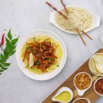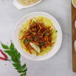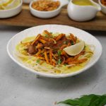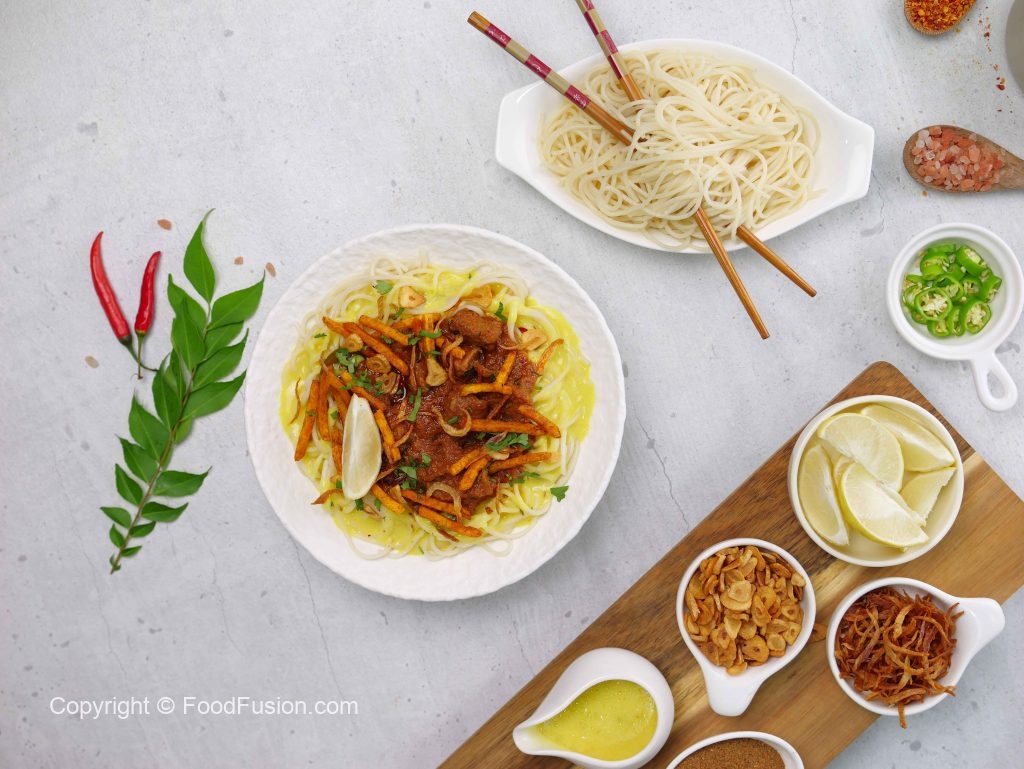 -In a serving plate,add spaghetti,prepared curry,beef currry,chips,fried garlic,fried onion,fresh coriander, lemon juice,chaat masala,lemon & serve!