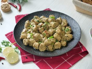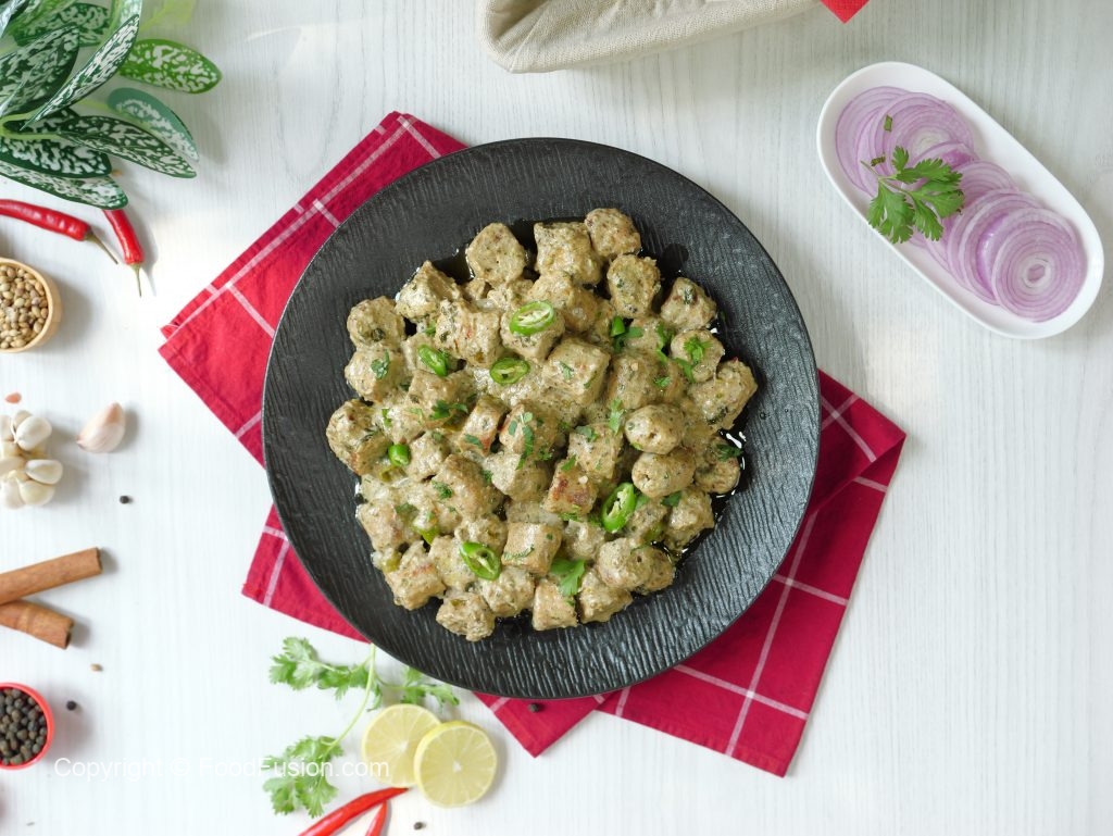-In a jug,add yogurt,coriander seeds,black pepper powder,pink salt,garam masala powder,cumin seeds, ginger,garlic,green chillies,lemon juice,cream,water,fresh coriander,mint leaves,blend well & set aside.