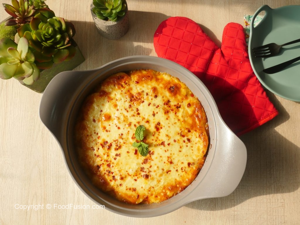 In an oven safe pot,add a layer of sliced & boiled potatoe,cooked chicken mince,mozzarella cheese and fresh coriander,repeat the layer one more time and top with boiled potatoes and pour the egg & cream mixture and mozzarella cheese.