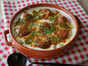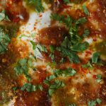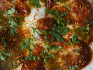 Serving dish mein steam dumplings rakh dein,dahi,date tamarind chutney aur hari chutney dal ker lal mirch crushed,zeera,namak aur hara dhania dal ker serve karein.