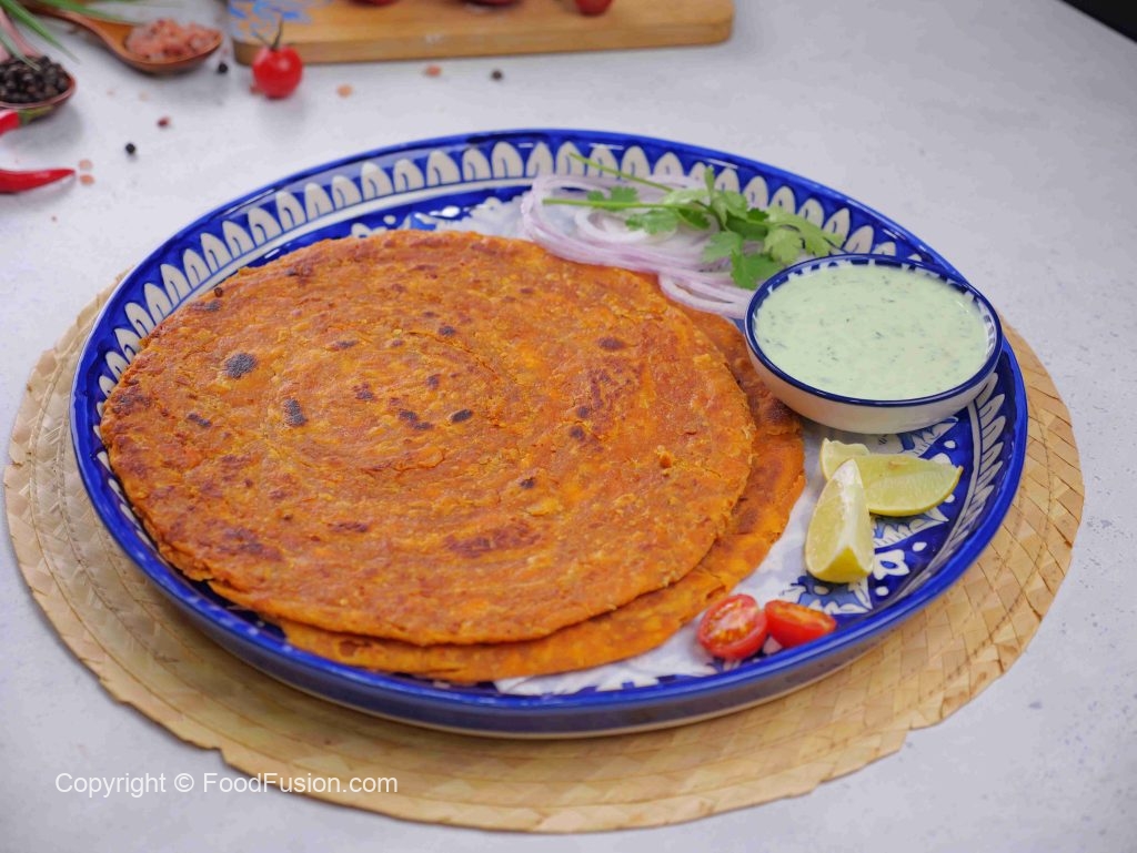 -On a heated griddle, place rolled dough,add desi ghee & fry from both sides until done (makes 5)