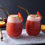In a blender jug add fresh strawberries, honey, fresh orange juice, crushed ice & blend well.