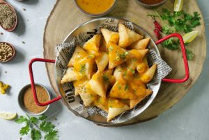 -Cut samosa sheet,make a pocket,add prepared potato filling (1 tsp) & roll into the shape of samosa and seal corners with all-purpose flour slurry & reserve remaining potato mixture for chutney.