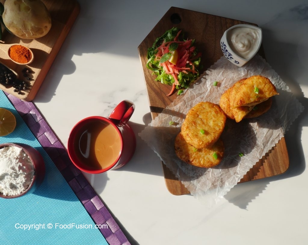Grease hands with oil,take a potato mixture and flatten on your palm,add chicken mince mixture and cover the filling with chicken mixture to make hash brown of equal sizes (makes 14-15) and freeze for 3-4 hours before frying.