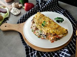On half side of omelet,add cheddar cheese,prepared sausages filling and mozzarella cheese.