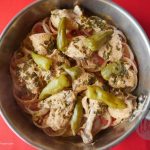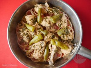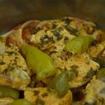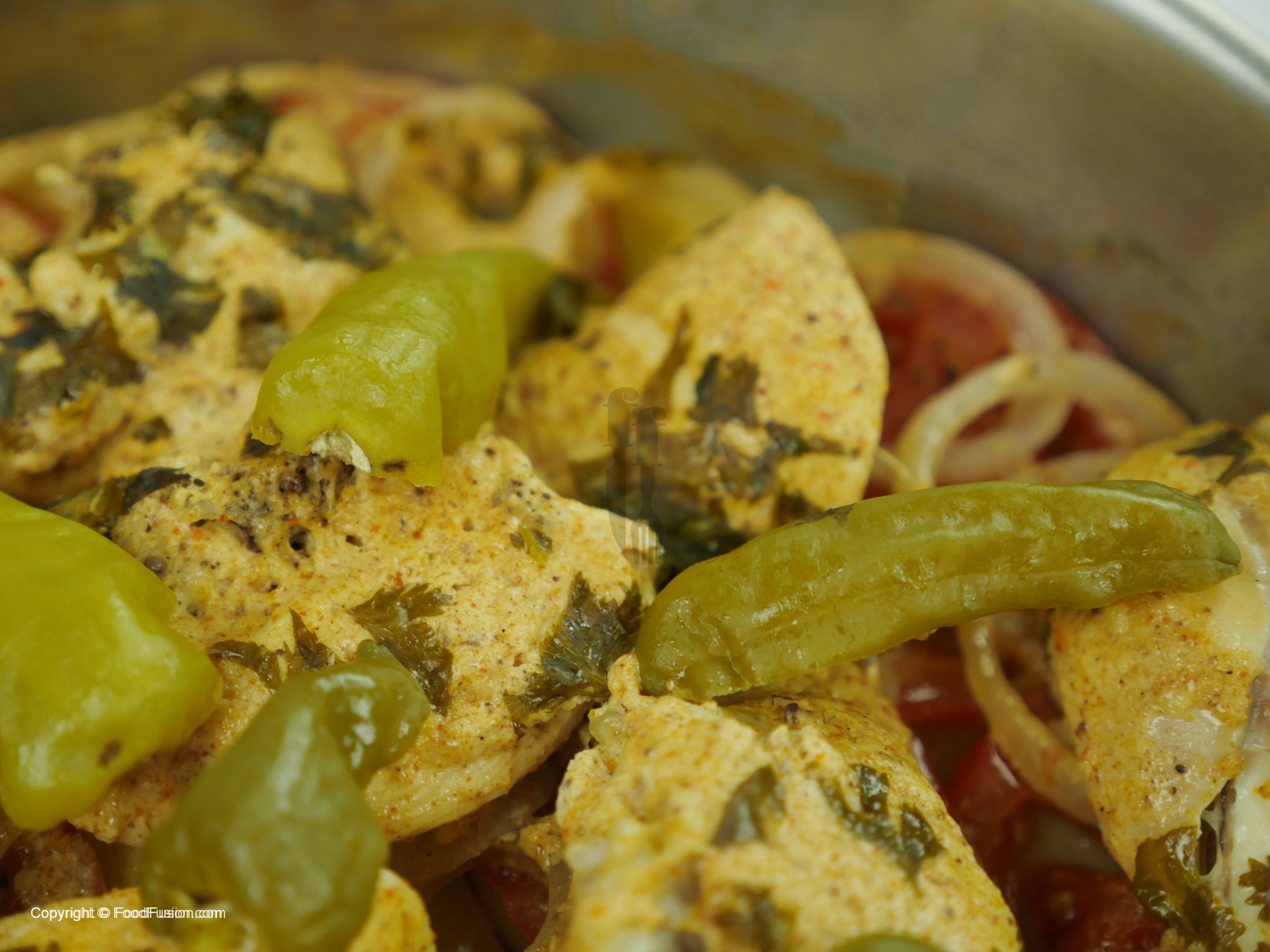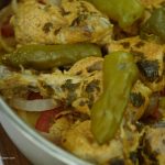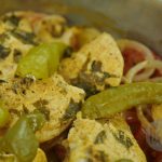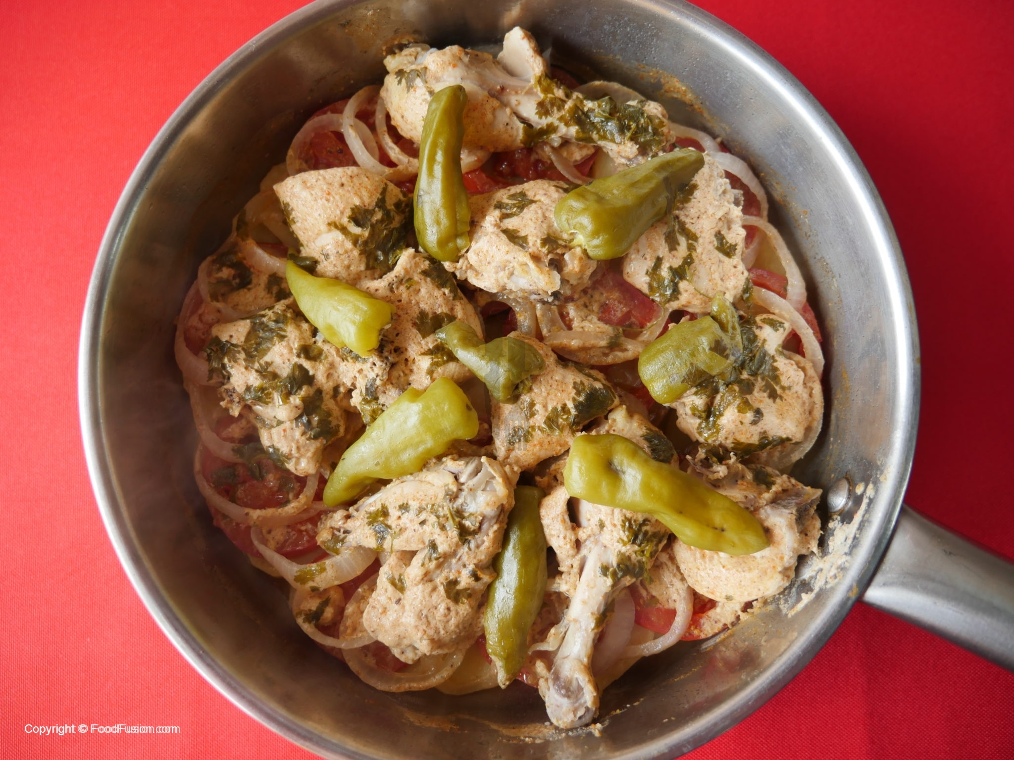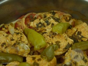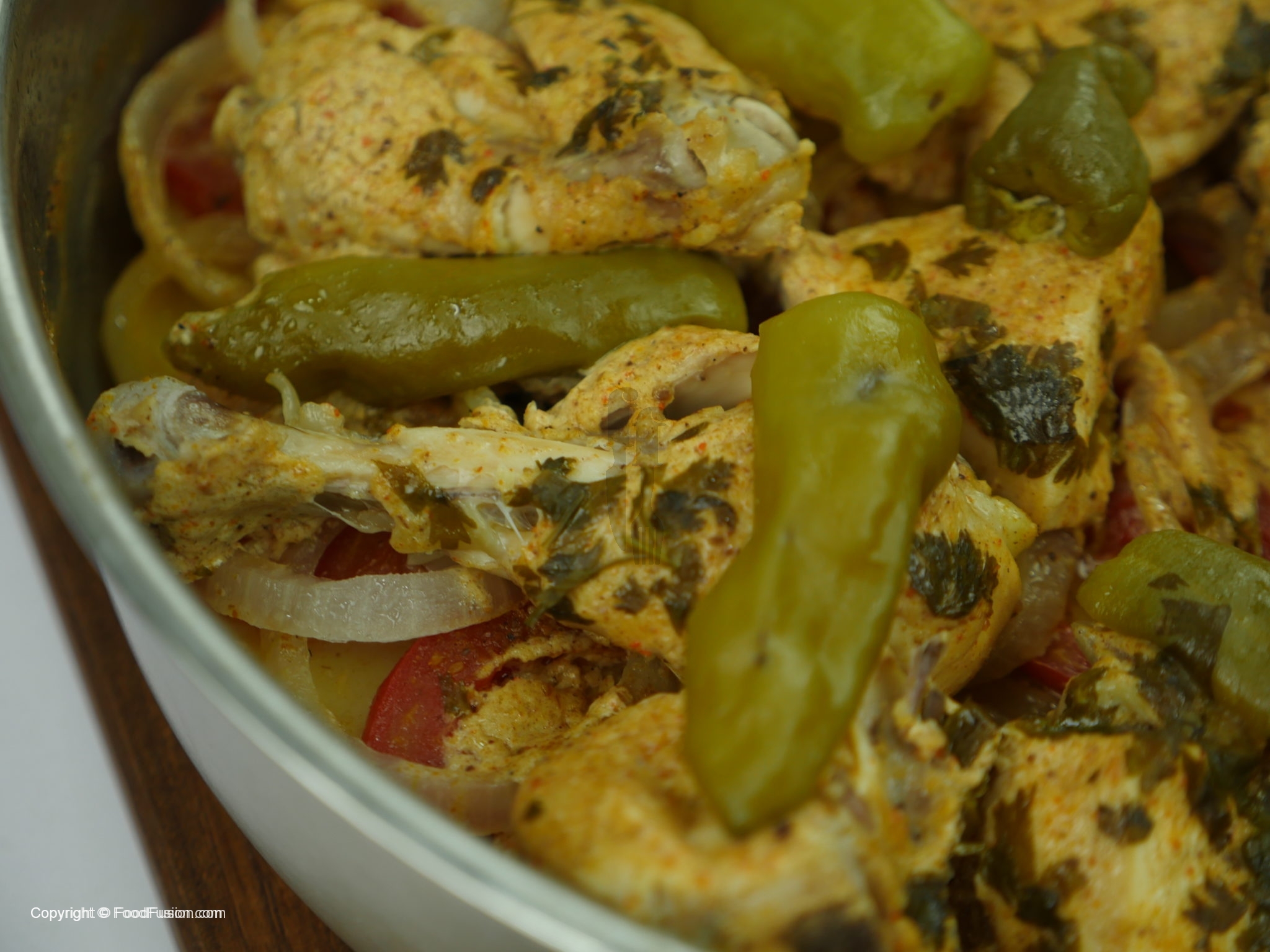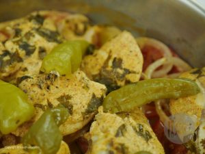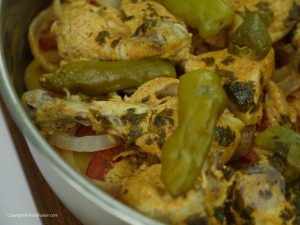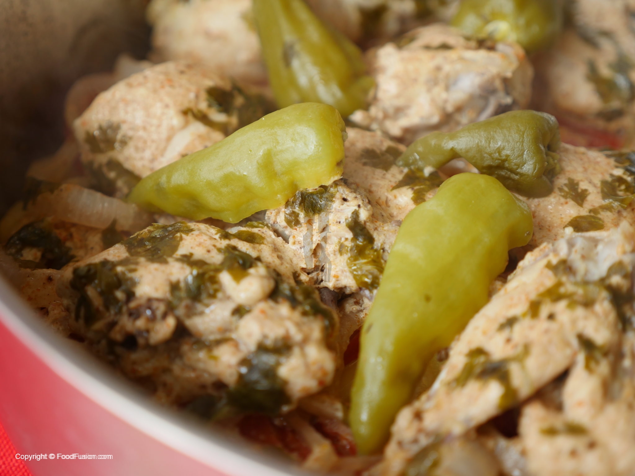 In pot,add oil,red potatoes,tomatoes,onion,chaat masala,marinated chicken,green chilies, coriander, cover and cook until chicken is done (approx.30-40 minutes).