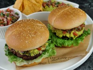 On burger bun,add & spread sour cream,lettuce leaves,beef patty,guacamole,salsa and top with burger bun.