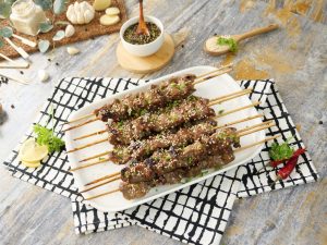 Thread marinated beef onto the wooden skewers (makes 10-12).