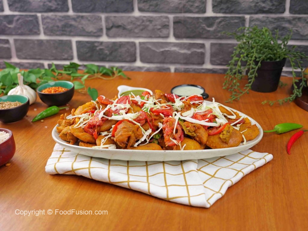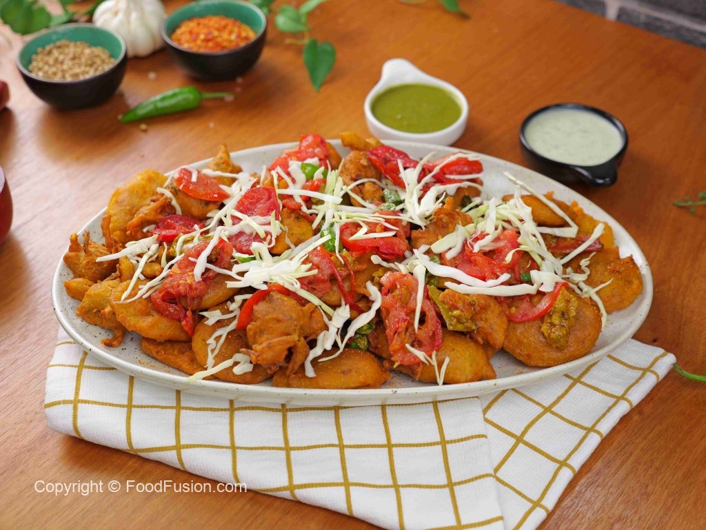 -Serving platter mein fried pakoray, fried tamatar aur hari mirch ke slices, achar dalein, band gobhi se garnish karen aur serve karen!
