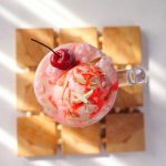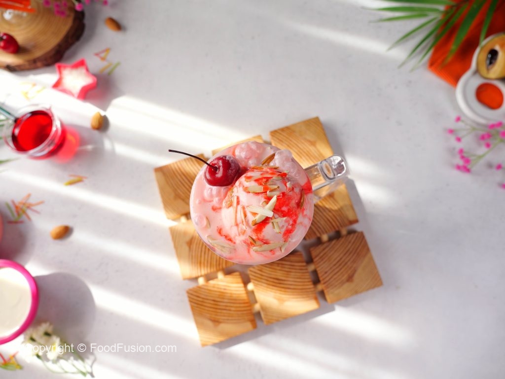 -In a serving glass add rose syrup, colourful vermicelli, soaked basil seeds, tutti frutti frozen dessert, prepared red jelly, apple, sapodilla, almonds, prepared rabri milk mixture, tutti frutti frozen dessert, garnish with rose syrup, almond, cherry & serve!