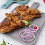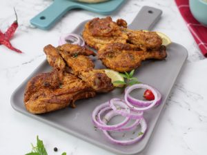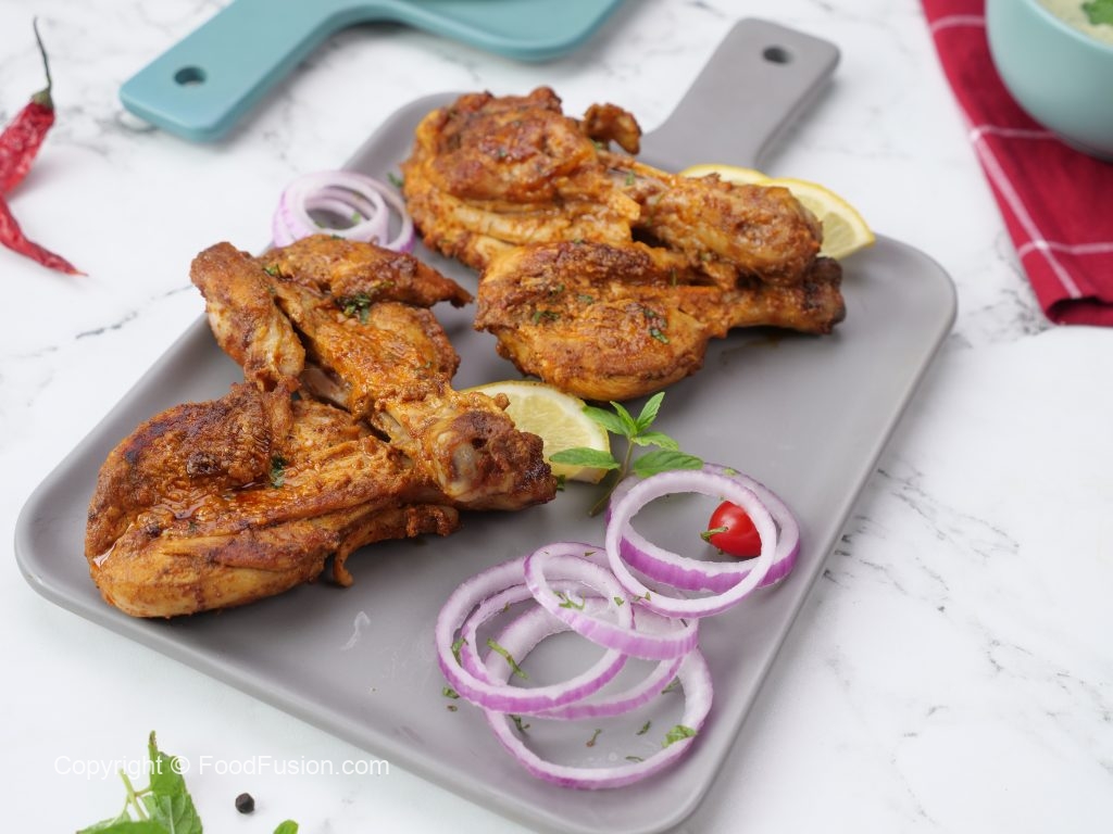 -On griddle,add cooking oil,marinated chicken,cover & cook on medium flame for 5-6 minutes then cook on high flame until chicken is tender & dries up (turn sides & apply remaining marinade in between).
