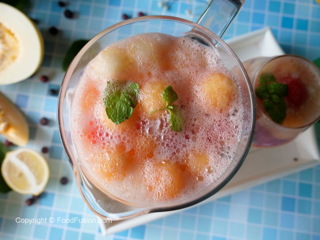 In a pitcher,add melon balls,watermelon balls,honeydew melon balls,prepared juice,7up,mint leaves,stir & serve!